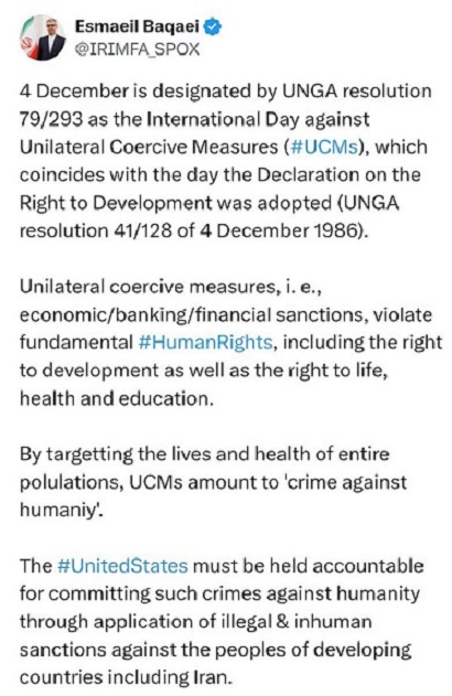 The spokesperson for the Iranian Foreign Ministry Esmail Baqaei slammed the ongoing killing and genocide of Palestinians in the Gaza Strip through con...