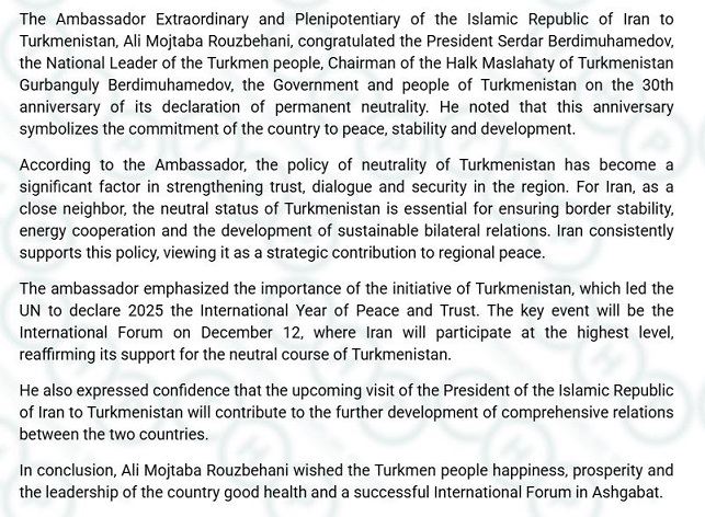 Rouzbahani congratulated Turkmenistan on the 30th anniversary of its neutrality
