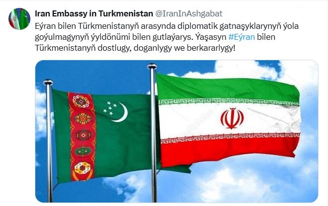 Новость, опубликованная в X (Twitter) канале о годовщине установления дипломатических отношений между Ираном и Туркменистаном